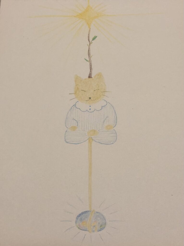 自分にしっぽが生えて、そのしっぽが地球の中心に向かってどんどん伸びるイメージをします。途中で美しい宝石が見つかり、その宝石にしっぽを巻き付けます。これで、上には輝く星、中心には自分、下には宝石があり、一直線になっているイメージをします。